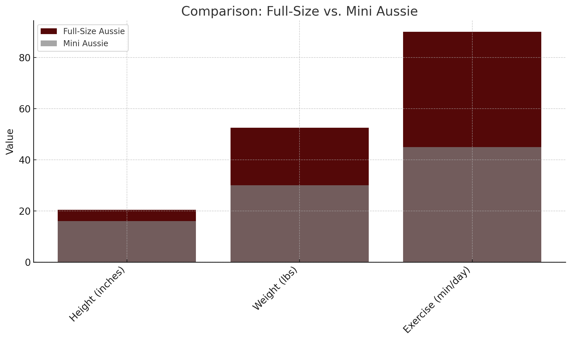 Breed authorities estimate that a full-size Australian Shepherd can burn over 1,500 calories each day when engaged in sustained ranch work or competitive activities (Vet Explains Pets), whereas a Mini Aussie typically meets its energy needs—and stays happily occupied—with just 30–60 minutes of varied mental and physical enrichment daily (Dogster).
